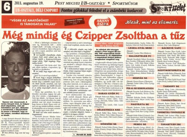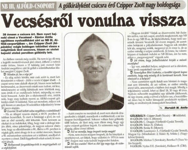„Rengeteg ötlettel és lelkesedéssel vagyok ellátva, úgymint a szurkolók bevonzása, illetve a csapatból, ha bárkinek bármi gondja van, ne a technikai vezetőt ostromolják, hanem szóljanak nekem. Mindeközben persze nézegetem a játékosokat az utánpótlásban, hátha találok olyat, aki felfedezett lehet, és persze próbálok olyan vállalkozókat a klubhoz csábítani, akik segíthetnek nekünk. Mert ugye, készülünk az NB III-ra, és ez nagy feladat.” Az elátkozott csapat. Még ha nem is mondtad, de ezt gondoltad, miközben a legtöbbször legszívesebben beálltál volna a hetvenedik percben, és ha eléd került volna a labda, biz’ Isten úgy beverted volna a vinklibe, mint Lagzi Lajcsi néhány évvel ezelőtt a babgulyás után küldött töltött káposztát. Másfél esztendővel ezelőtt tele voltál tervekkel és tenni akarással, ami mit sem változott, de az élet valamiért nem adta meg, hogy rögtön bajnok legyél a Vecséssel – nem csatárként, hanem klubmenedzserként. Hosszú út végére érhet a VFC vasárnap délután, de a java csak ezután kezdődik. Ám miközben a mozaikdarabkákat rakod össze a hét utolsó napjára, gondolj arra, hogy az ünnep már szombat este kezdetét veheti. Huszonnégy év után ismét csúcsra érhet a Honvéd, amelynek öregfiú-csapatát nem véletlenül erősíted. Úgy lehetsz vele, ami ott nem jött össze – bajnoki cím helyett „csak” második hely –, az összejöhet szombat este, a Videoton ellen. Május 28-án az egy főre jutó pezsgőfogyasztás Vecsésen és környékén meghaladhatja az előző év utolsó napján regisztrált maximumot, ám miközben titokban a hűtőládába pakolod az itt-ott összekoccanó palackokat, egyet hagyj kinn, hátha szükséged lesz rá szombat este háromnegyed kilenc tájban – nem CSAK úgy…