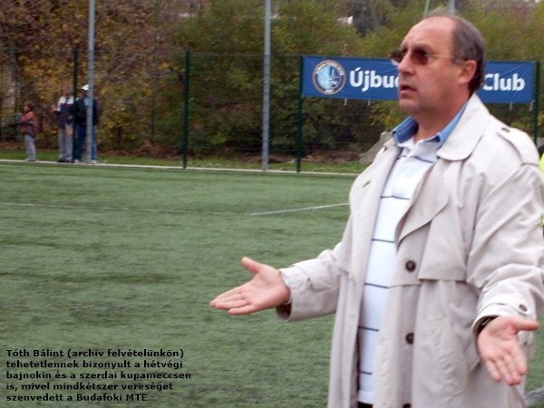 Az NB II 19. fordulójában Tóth Bálint a vendégcsapat mestereként tért vissza a néhai Bányász-stadionba, Tatabányára. A Budaörs ideiglenes otthonában a magunk mögött hagyott vasárnapon 2–1-es vereséget szenvedett a Budafok ott, ahol idestova két évtizede a Magyar Kupa-fináléig vezette a helyi alakulatot. Csakhogy az 1999. május 20-án, Vácon megvívott, mindmáig sokat emlegetett MK-döntőben a Debreceni VSC 2–1-es sikert aratott úgy, hogy Bagoly Gábor góljára Kiprich József a második félidő elején még válaszolni tudott, ám a kapus Gelei Károly 80. percben szerzett öngólja eldöntötte a serleg sorsát. November 29-én, szerdán a Tóth Bálint vezette Budafoki MTE hazai pályán, zárt kapuk mögött szenvedett 3–0-s vereséget a DVSC-től úgy, hogy a 85. percben még csupán 0–1 volt az állás Justin Mengolo góljának köszönhetően, ám a hajrában Tisza Tibor triplázott, előbb tizenegyesből, majd akcióból vette be Szabó Balázs hálóját.