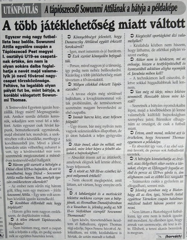 Az alábbiakban közelebbről is megismerhetik Sowunmi Attilát az ezen sorok írójától 2010. április 16-án a Sportszeletben megjelenő interjújából.