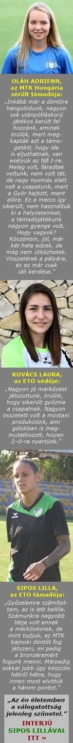 Itt tulajdonképpen be is fejezhetnénk a tudósítást, de azt azért feltétlenül meg kell jegyezni, hogy az első félidőben önmagát csak kereső vendéglátó a folytatásra feljavult, lehetőségei is akadtak, de ezen a napon nem volt átütőerő a játékában. Az ETO pedig a térdét fájlaló Csötönyi Tímea kiválása után is stílusos futballal, közönségvonzó gólokkal hagyott nyomot a Szőnyi úton. És ha az építkezés hasonló ütemben zajlik a nyáron, mint a télen, akkor a kisalföldiekből nagy csapat lehet – akár már jövőre.