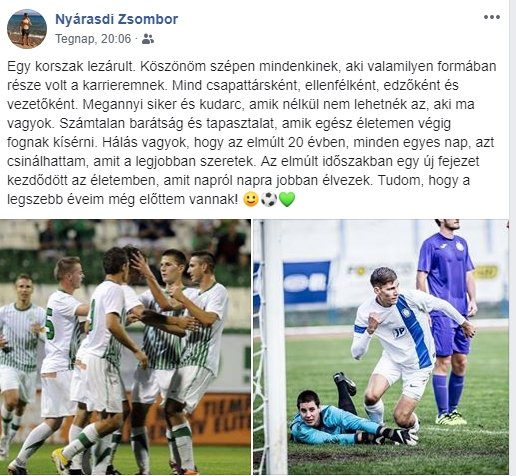 A Kispesten nevelkedő, majd a Ferencvárosban pallérozódó, felnőtt labdarúgóként a BKV Előre, a Jászberény, a III. Kerületi TVE, a Pécsi MFC és a Pilisi LK szerelését viselő Nyárasdi Zsombor – aki a magunk mögött hagyott szezonban 24 bajnokin háromszor bizonyult eredményesnek – így köszönt el: „Egy korszak lezárult. Köszönöm szépen mindenkinek, aki valamilyen formában része volt a karrieremnek. Mind csapattársként, ellenfélként, edzőként és vezetőként. Megannyi siker és kudarc, amik nélkül nem lehetnék az, aki ma vagyok. Számtalan barátság és tapasztalat, amik egész életemen végig fognak kísérni. Hálás vagyok, hogy az elmúlt 20 évben, minden egyes nap azt csinálhattam, amit a legjobban szeretek. Az elmúlt időszakban egy új fejezet kezdődött az életemben, amit napról napra jobban élvezek. Tudom, hogy a legszebb éveim még előttem vannak!”