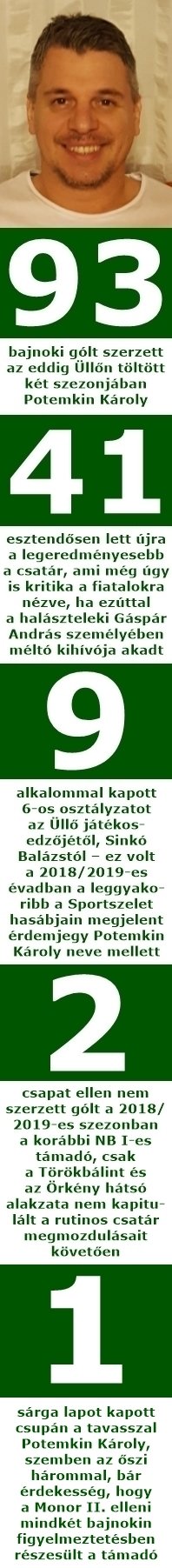 – Dehogyis, abszolút nem, ezért sem játszottam már a bajnokság végén – mondta határozottan Potemkin Károly, a Pest megyei II. osztály, Déli csoportjában 4. helyen záró Üllő SE csatára. – Inkább azon élcelődtünk, hogy a csapattársam, »Simi«, azaz Simon Zsolt eljátszotta velem félévkor meg tavaly is, hogy nem én lettem a legeredményesebb. Miután mindig őt kérdeztem, lévén pont úgy alakult, hogy ő volt hozzám a legközelebb, és kurva jól csinálja: megnézte a telefonját, és sorolta: „baszd meg, hatot rúgott a gyerek”. És tényleg olyan fejjel tudja mondani, először még el is hiszi az ember. Egyébként azon röhögtünk, hogy ez vele meg is történt. Úgy nem lett gólkirály előttem – én ugye két éve vagyok itt, vele meg három esztendeje esett ez meg –, hogy az utolsó fordulóban valakivel rúgattak jó néhány gólt, így nem lett ő a legeredményesebb… Nem szokás az ördögöt a falra festeni, de azért mondogattuk, végül is négy gólt rúghat a halászteleki Gáspár András, meg aztán az utolsó két-három fordulóban már nem voltam játékra alkalmas állapotban.