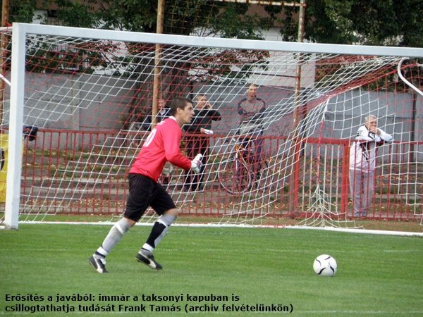 Az első félidő közepén az NB I-et is megjárt kiváló támadó, Farkas Krisztián a büntetőpontra letett labdát Frank Tamással szemben a jobb kapufára bombázta, a második felvonás hajrája előtt pedig a taksonyi kapus nagy pillanatai következtek. Antal Dominik gyakorlatilag ugyanoda lőtte a megítélt 11-est, mint rutinos csapattársa, csak félmagasan, ám a jó irányba mozduló kiváló sportember kiütötte a gólba tartó labdát. A karrierje során nem először büntetőt védő (lásd lentebb, a cikkre kattintva) Frank Tamás Taksonyban való szerepvállalása azért nem számít meglepetésnek, mert a Halásztelek FC öregfiú-egyletében két tapasztalt taksonyi labdarúgóval, Demjén Zoltánnal és Hégner Zoltánnal is együtt futballozik.