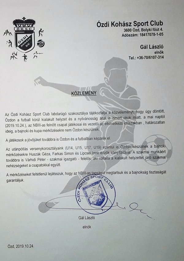 No igen, merthogy az elmúlt napokban az alábbi közlemény látott napvilágot: „Az Ózdi Kohász Sport Club labdarúgó szakosztálya tájékoztatja a közvéleményt, hogy úgy döntött, Ózdon a futball körül kialakult helyzet és a nyilvánosság által is ismert okok miatt, a mai naptól (2019.10.24.), az NB III-as felnőtt csapat játékosai és vezetői az elkövetkező időszakban, határozatlan ideig, a bajnoki és kupa mérkőzésekre nem Ózdon készülnek. A játékosok a jövőjüket továbbra is Ózdon és a futballban képzelik el. Az utánpótlás versenykorosztályaink (U14, U15, U17, U19) ezentúl is Ózdon készülnek a bajnoki mérkőzésekre Huszák Géza, Farkas Simon és Lipcsei Imre edzők irányításával. A szakmai munkáért továbbra is Várhidi Péter – szakmai igazgató – felelős, aki vállalta a kialakult helyzettel járó szakmai nehézségeket a csapatokkal együtt. A mérkőzéseket feltétlenül lejátsszuk, hogy az NB III-as tagságot megtartsuk és a bajnokság tisztaságát garantáljuk.