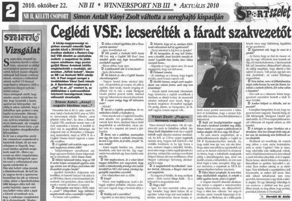 Csakhogy a hét elején Klausz Lászlótól megvált a CVSE vezetősége és némi meglepetésre Nagy Tibort nevezte ki a gárda élére. A korábbi kiváló középhátvéd a nyáron adott interjújában korántsem köntörfalazott a Vác FC-től való távozásával kapcsolatban, és bár azóta a megyei másodosztályú Vác-Deákvárt irányította, azért az ottani másod- és a magyar másodosztály nem összekeverhető. Az a furcsa helyzet állt elő, hogy míg legutóbb Richárd fiával dolgozott együtt Vácon, addig Cegléden a III. Kerületi TVE-től nemrégiben távozó Tamás fiával küzdhet egy célért.